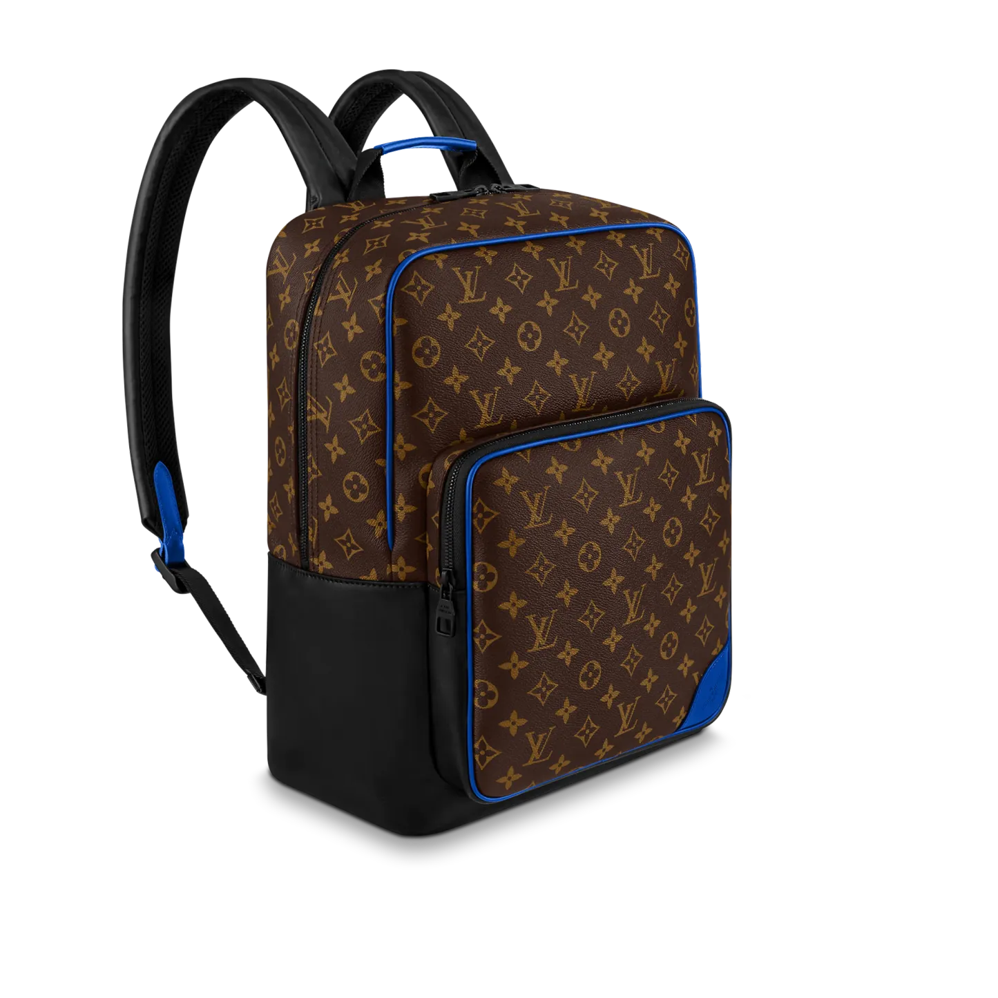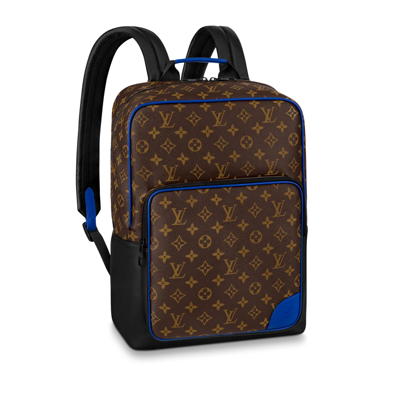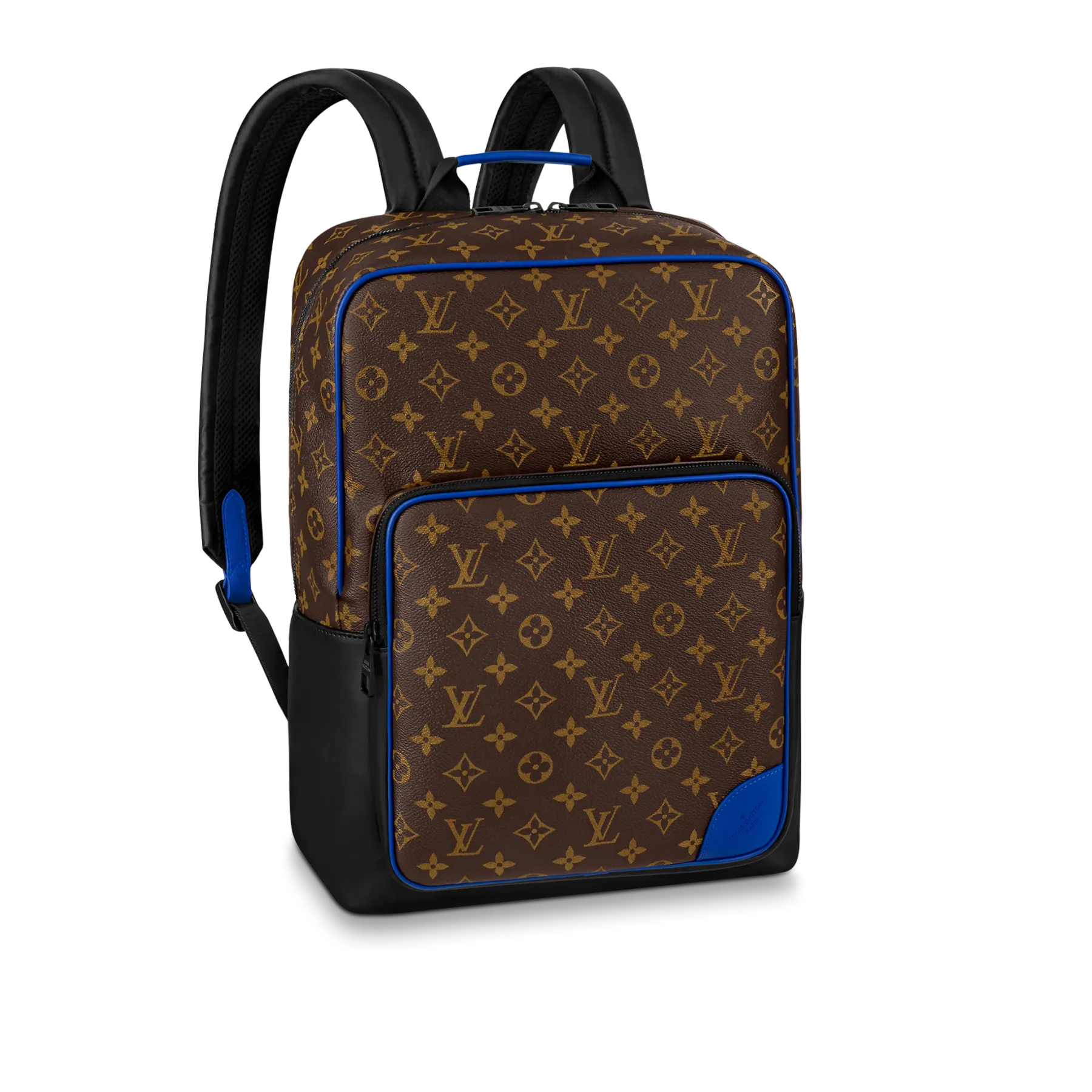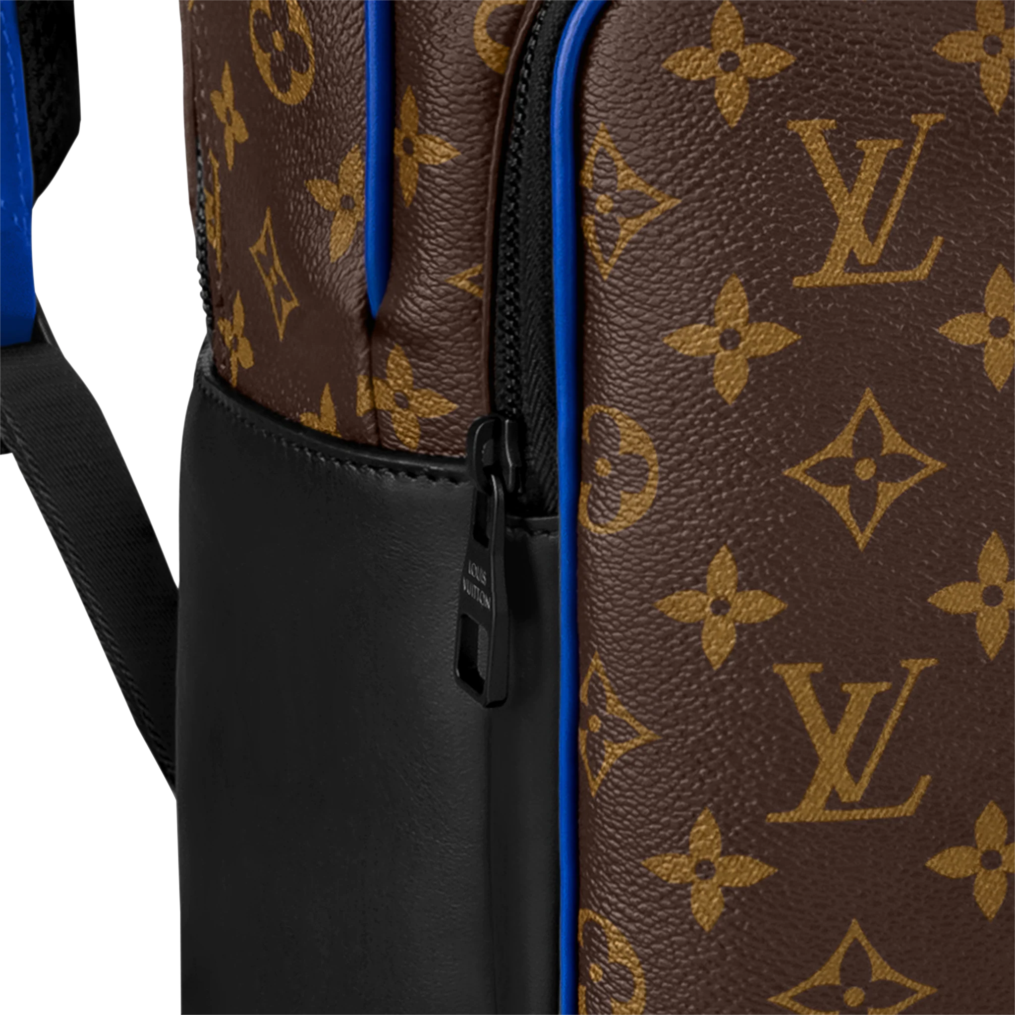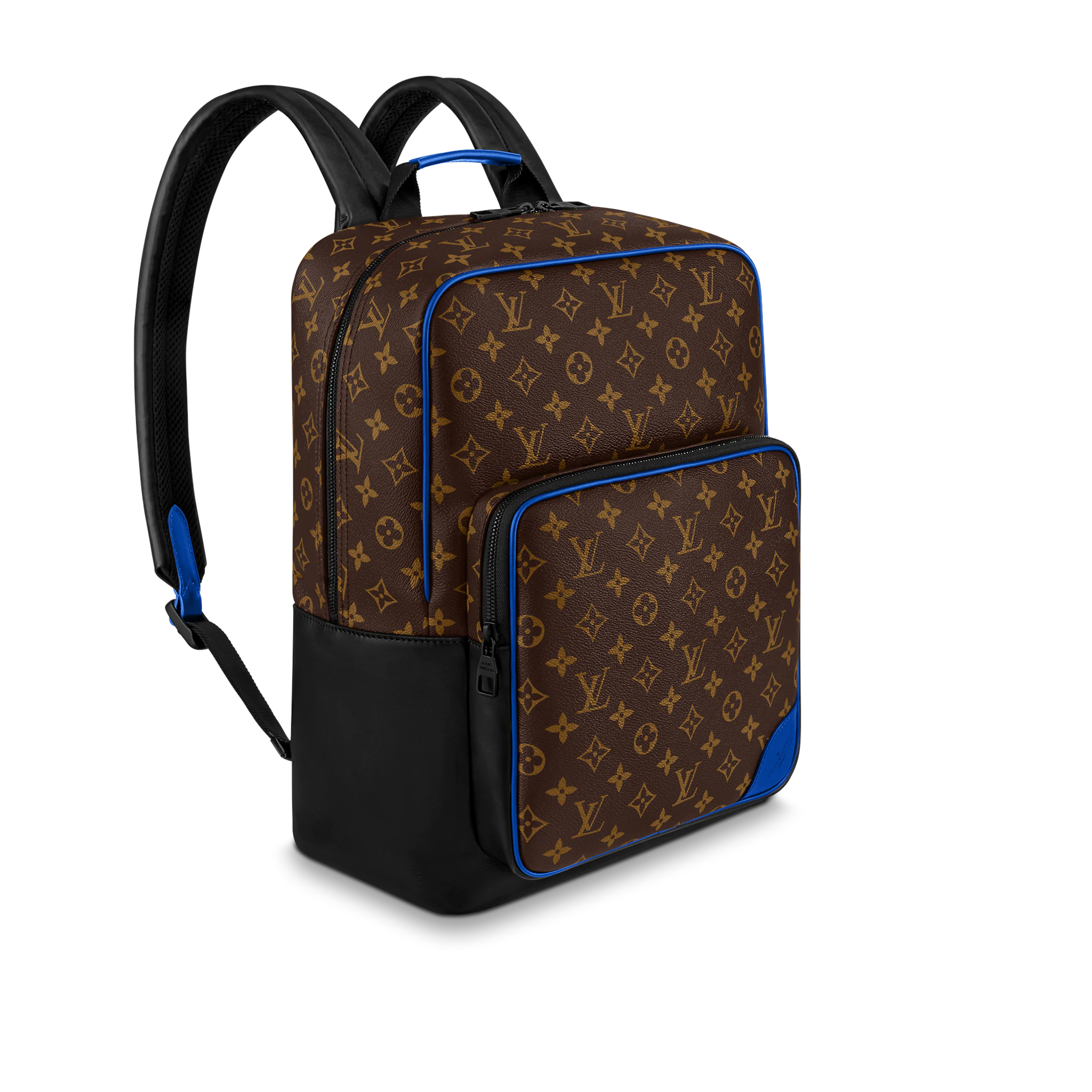 モノグラム・マカサー キャンバスにカウハイドレザーのトリミングを施した「ディーン・バックパック」。下部のコーナー、トップハンドル、フロントの外ポケット周辺に鮮やかなブルーをあしらい、モダンな雰囲気に仕上げました。ファスナー付きのフロントポケットに加え、内側には3つのポケットを備え、ノートパソコンも収納できます。