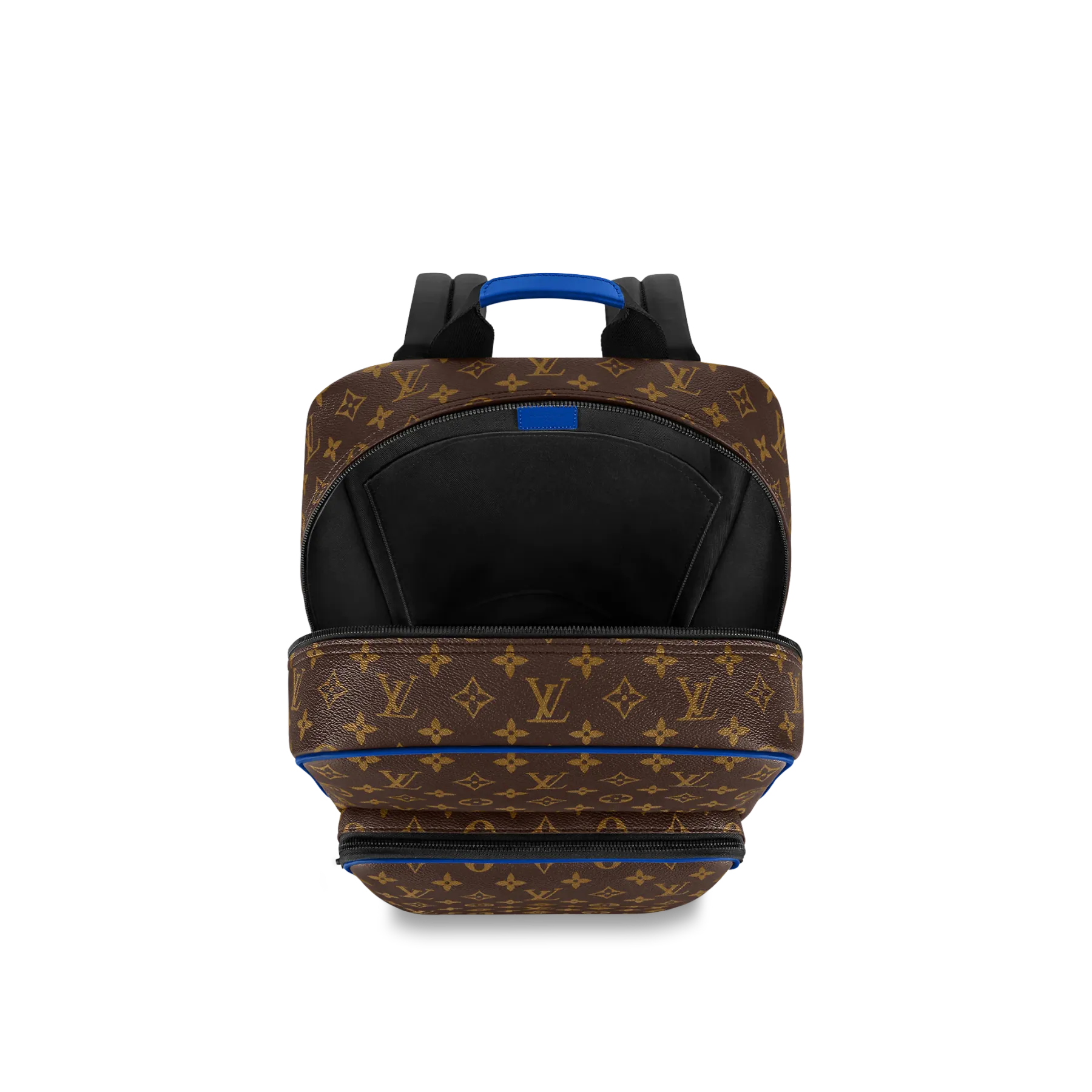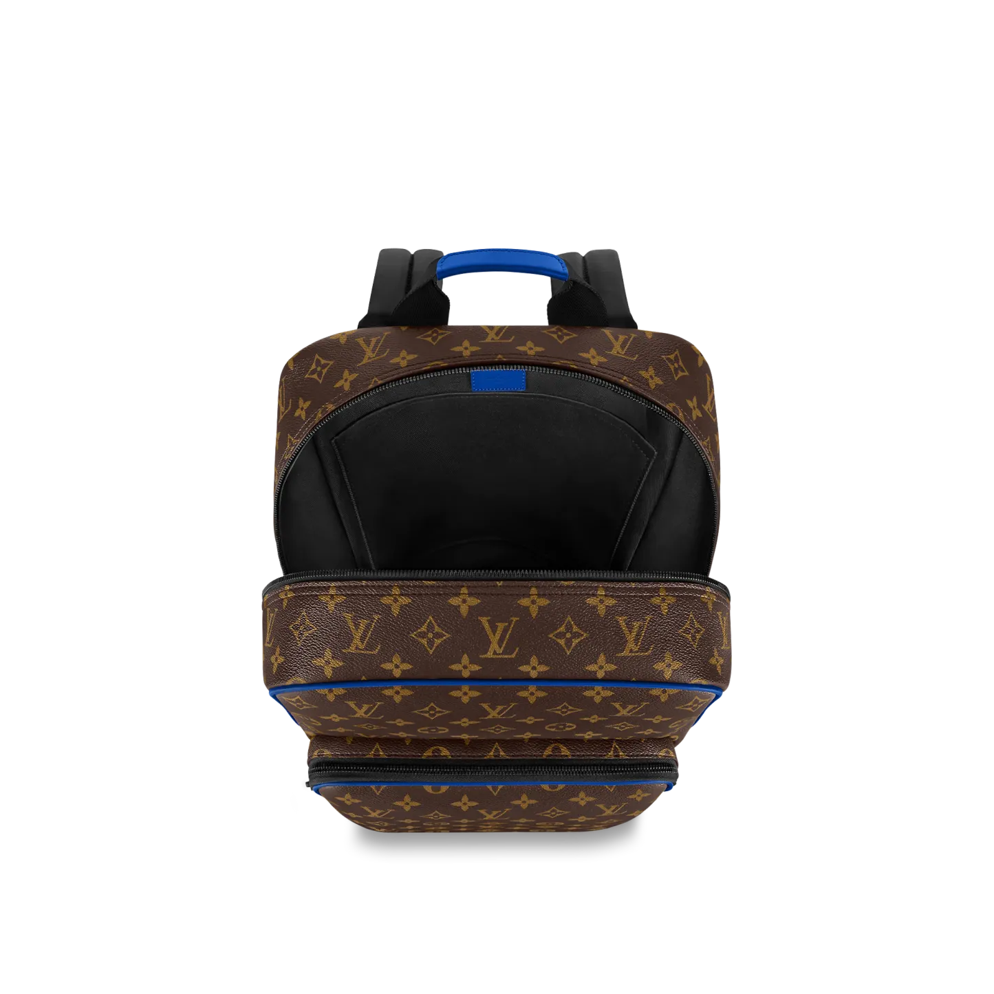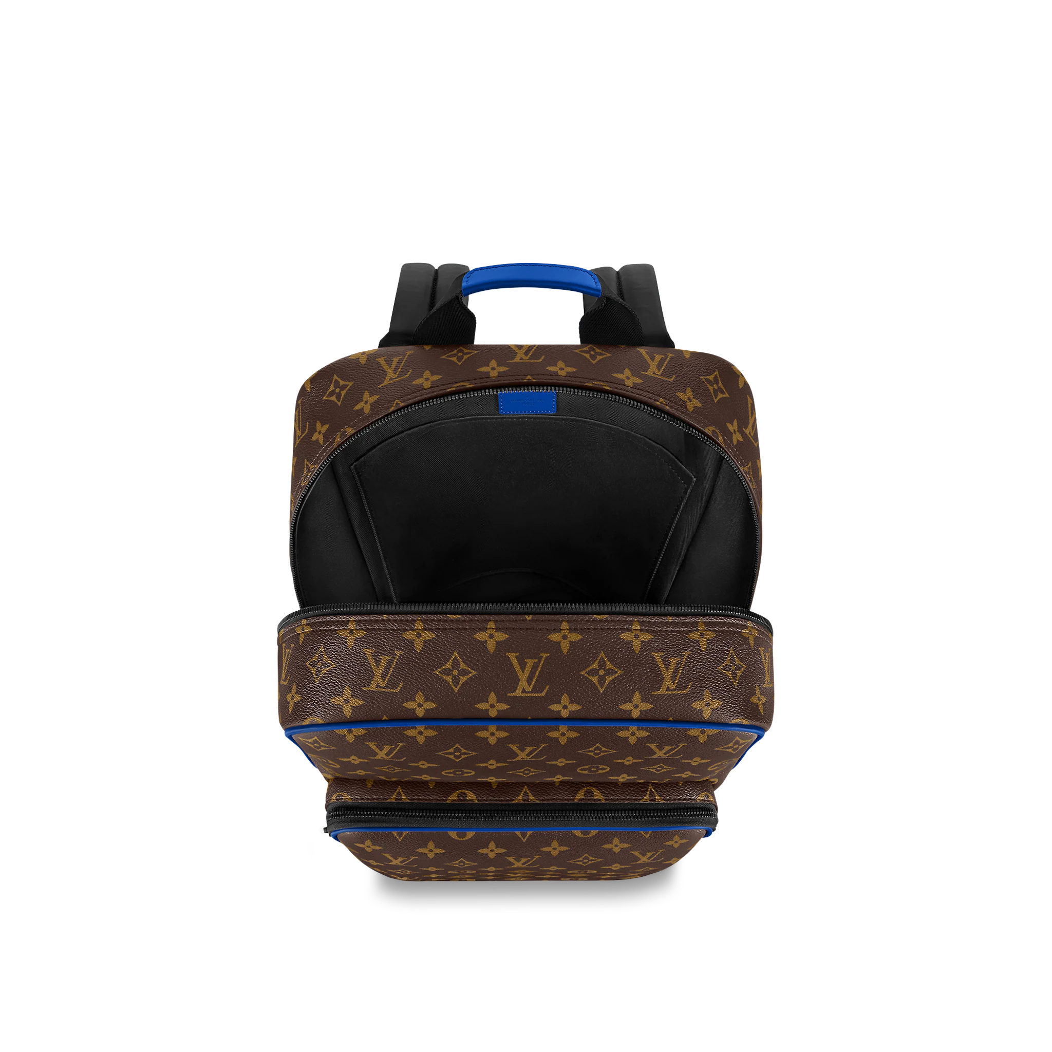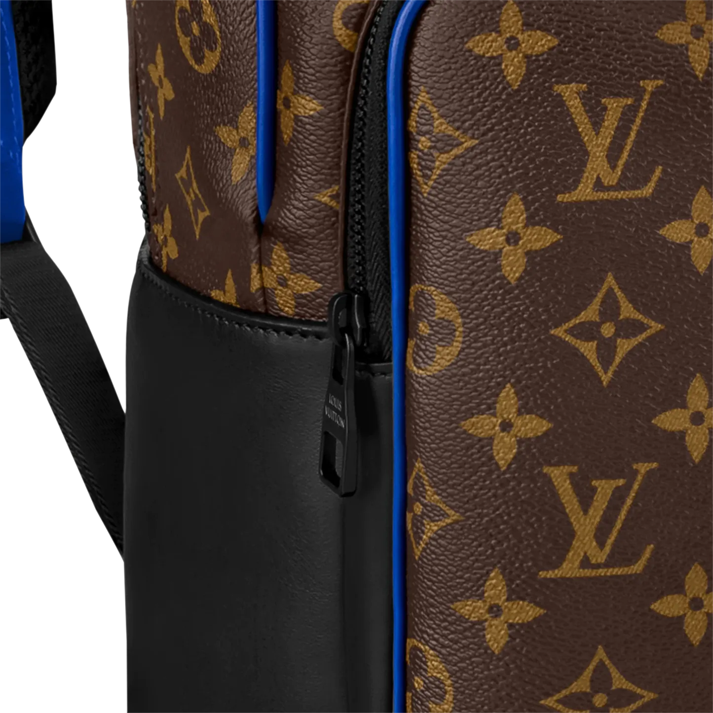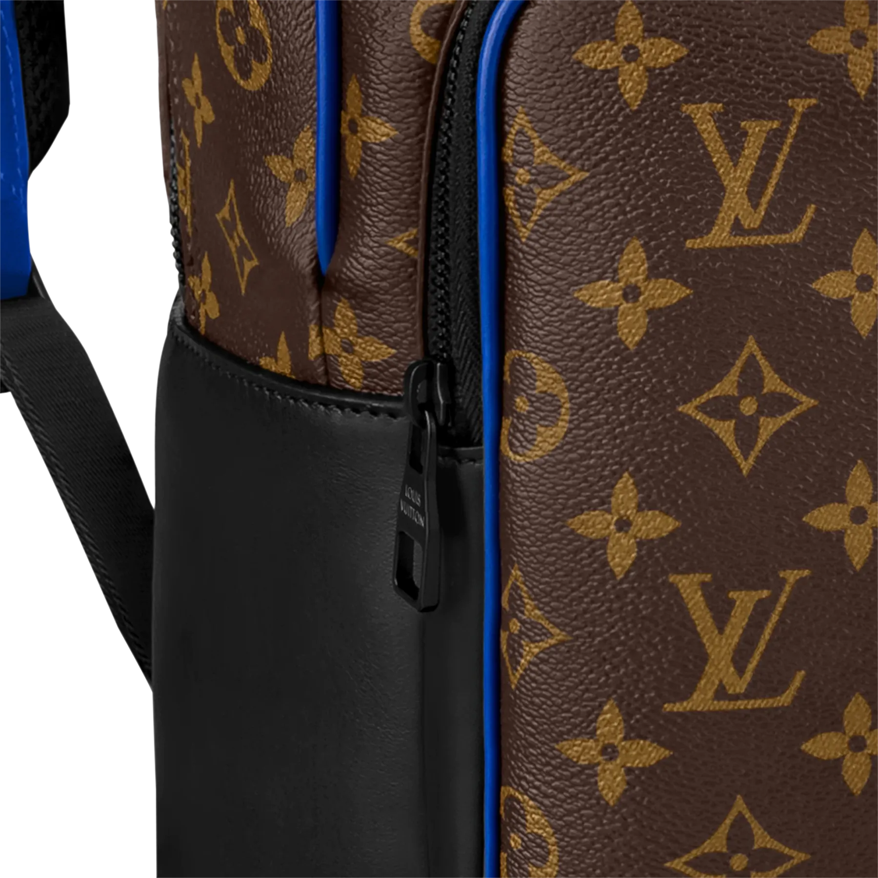 モノグラム・マカサー キャンバスにカウハイドレザーのトリミングを施した「ディーン・バックパック」。下部のコーナー、トップハンドル、フロントの外ポケット周辺に鮮やかなブルーをあしらい、モダンな雰囲気に仕上げました。ファスナー付きのフロントポケットに加え、内側には3つのポケットを備え、ノートパソコンも収納できます。